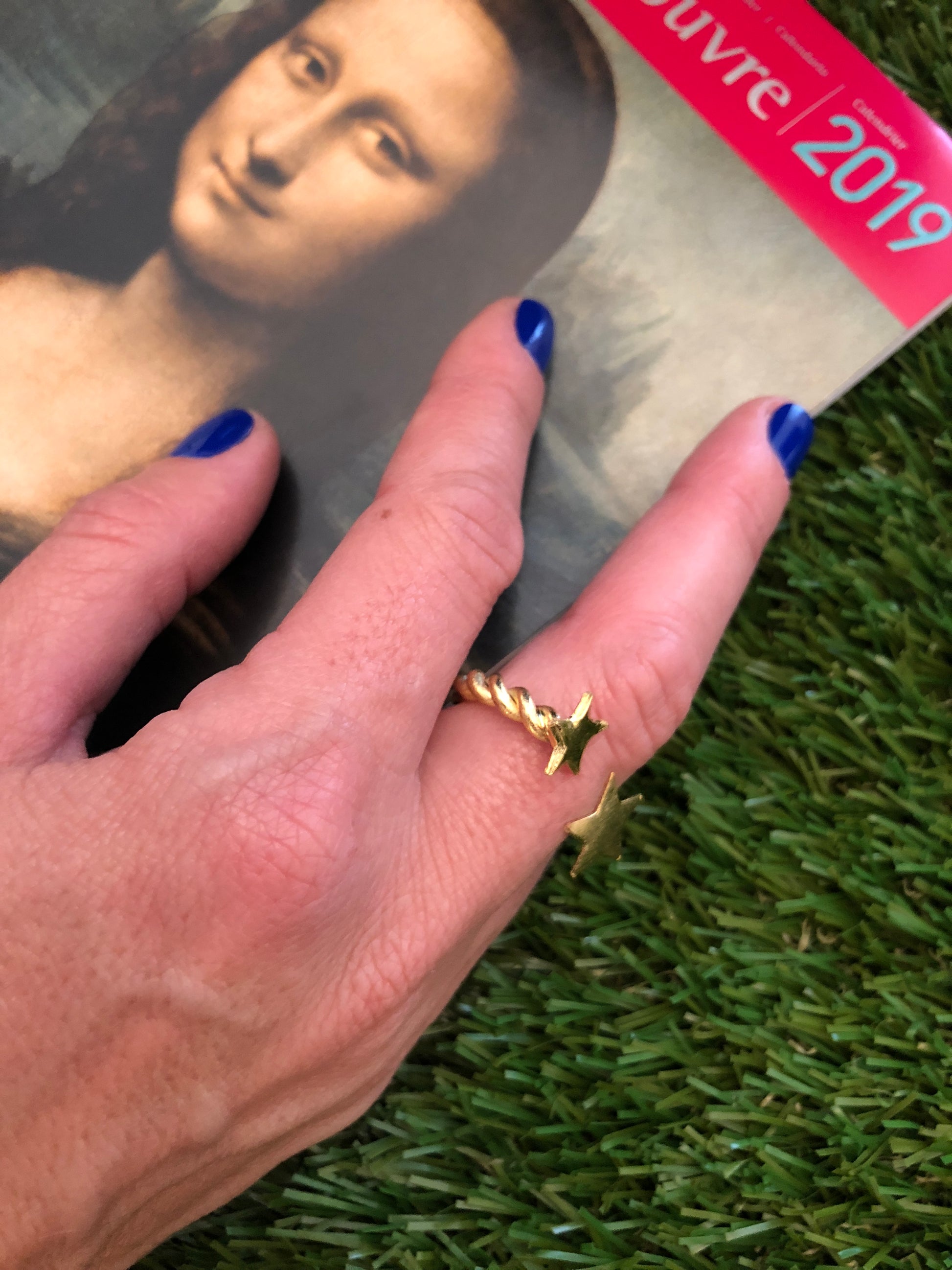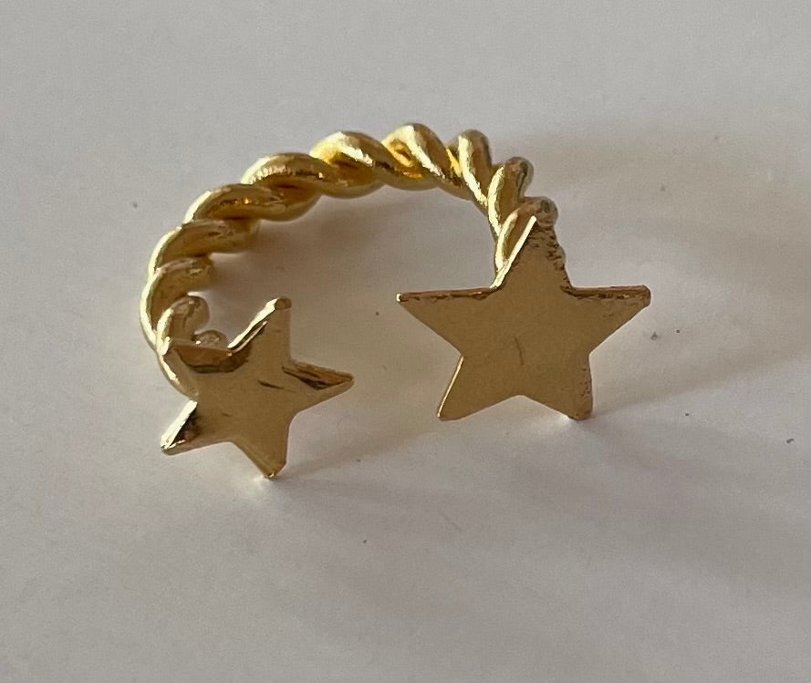 Anillo hecho a mano de cobre y baño de oro 18k con dijes de estrellas, se hace a la medida deseada.. el modelo de la foto es talla 7.