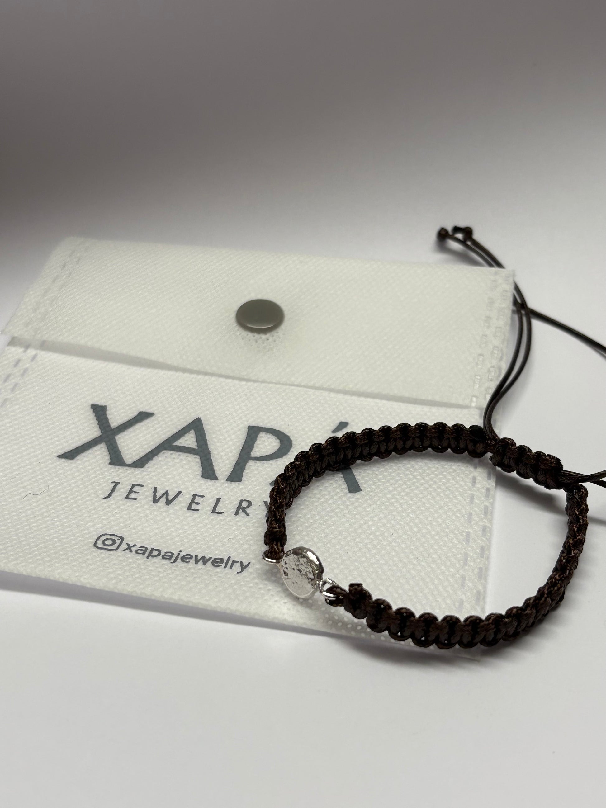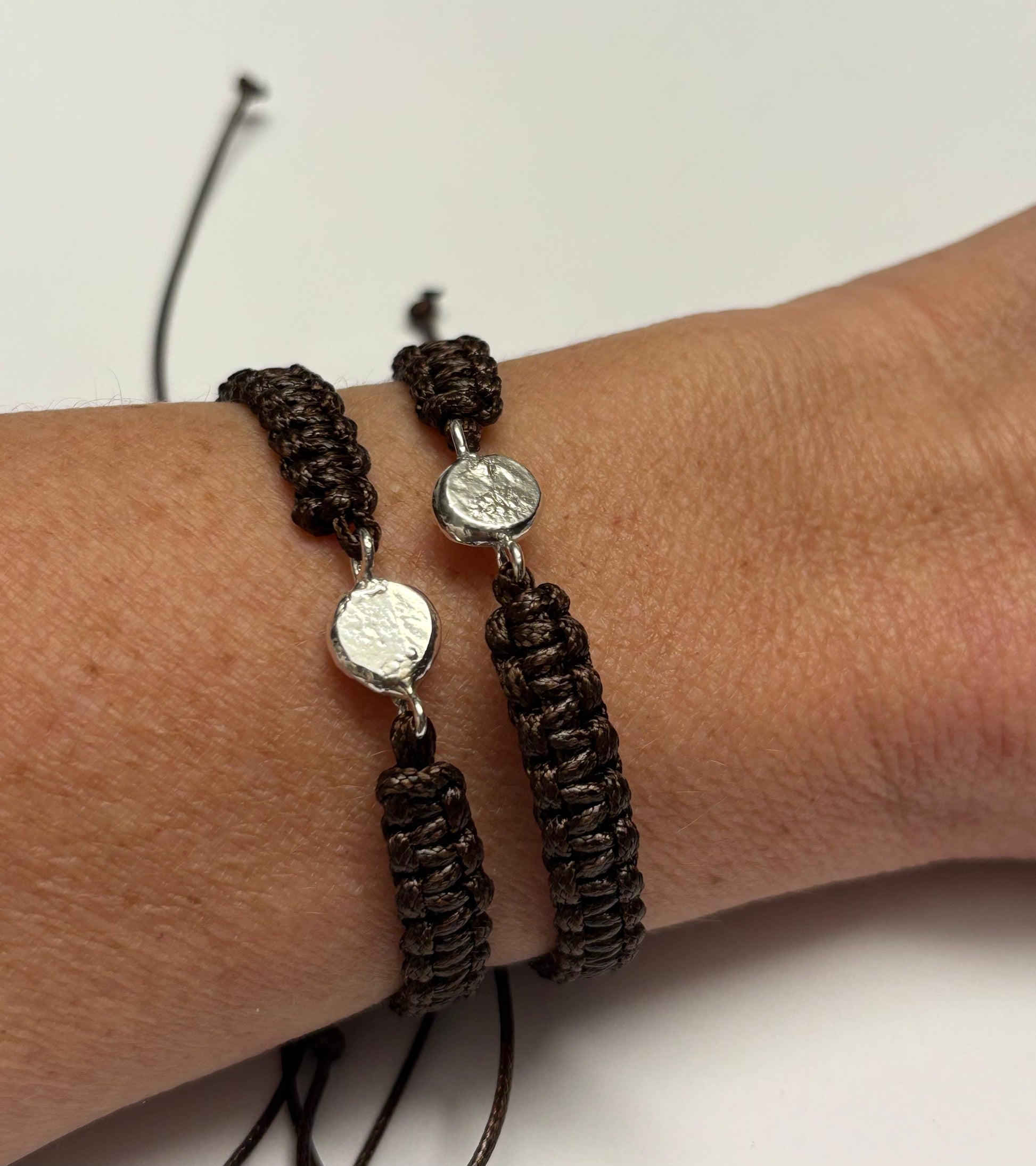 Brazalete tejido con hilo de cuero encerado y dije de plata reciclada hecho a mano, se puede personalizar.