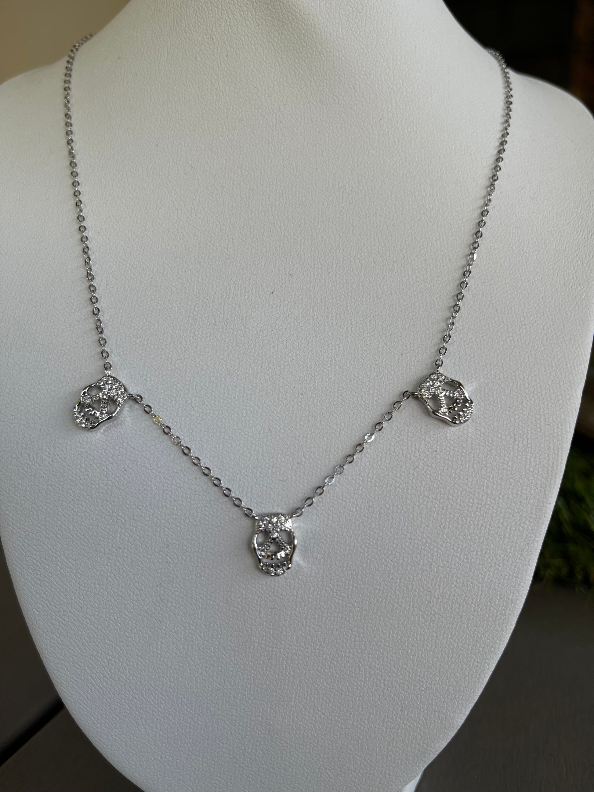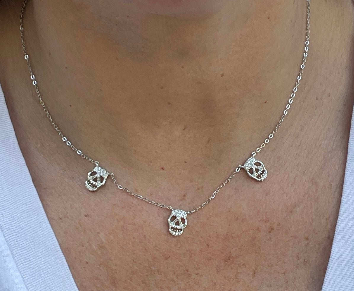 Cadena de plata de ley con 3 dijes de calaveras, mide 40 cm.