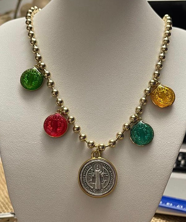 Cadena con dijes de San Benito esmaltados de colores