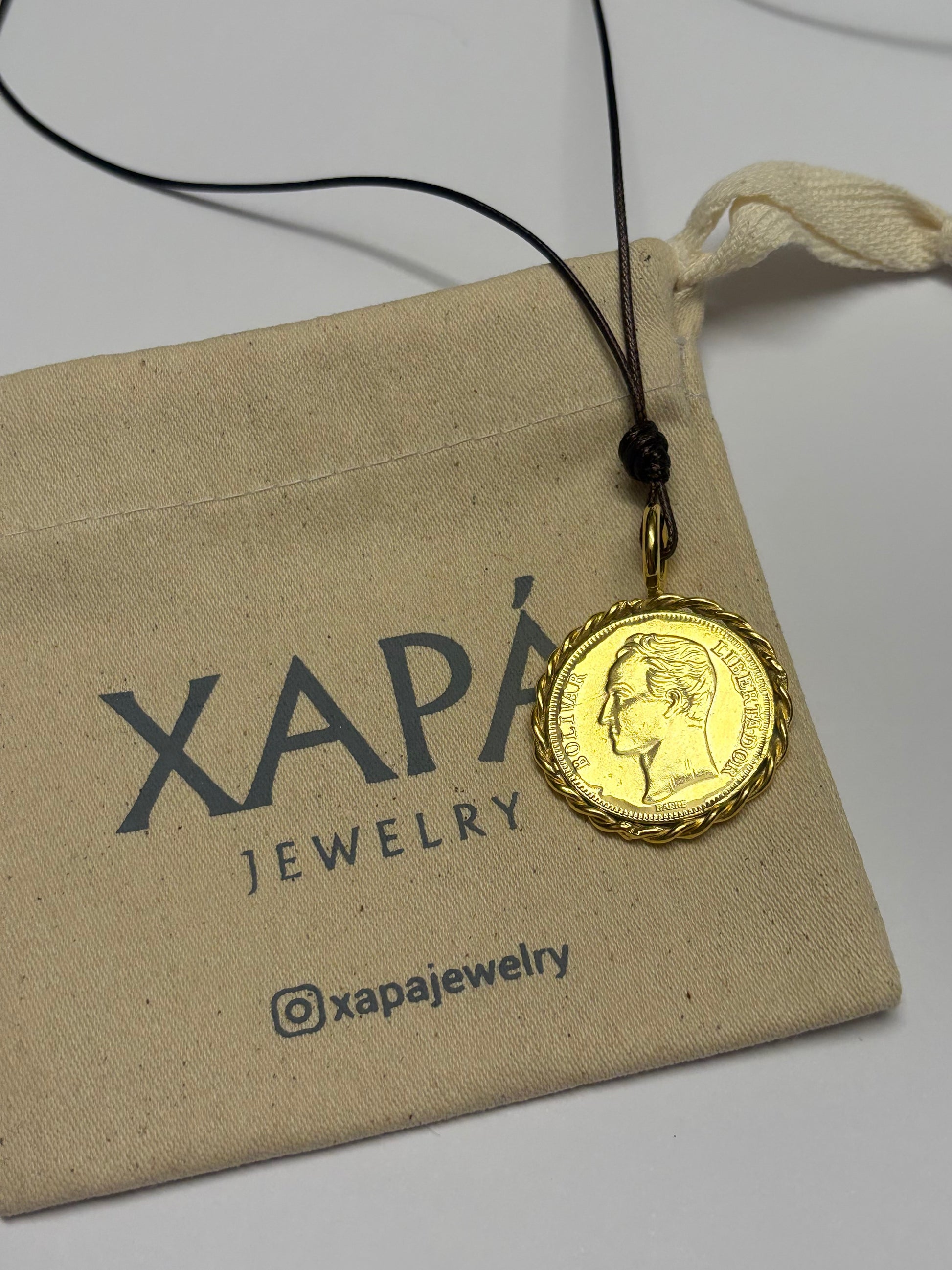 Collar de cuero ajustable con dije de moneda venezolana de 2Bs con hilo trenzado alrededor y baño de oro