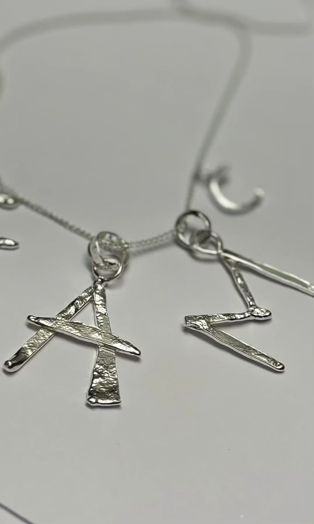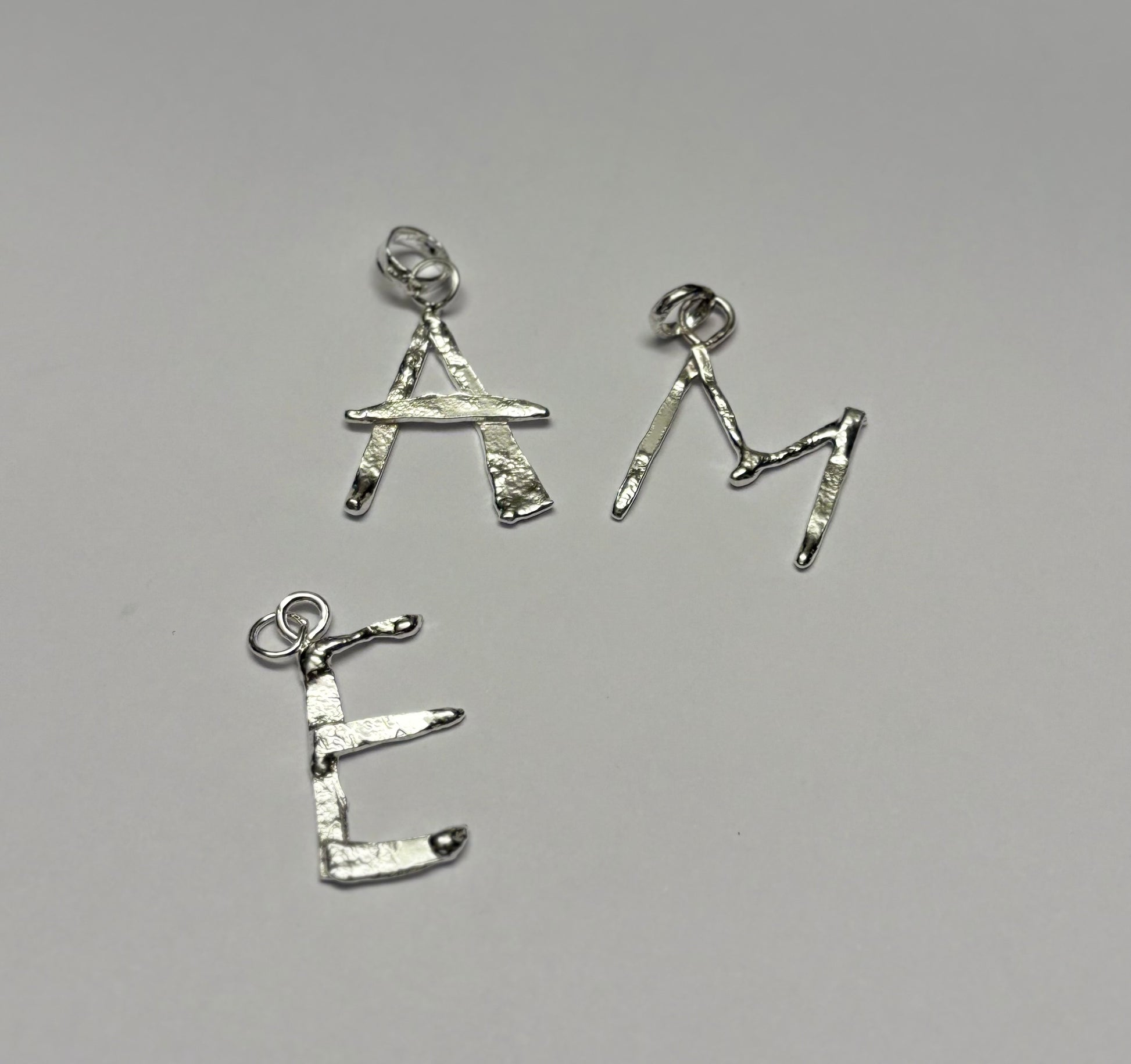 Dijes hechos a mano reciclando retazos de plata, miden aprox. entre 2 y 3cm de largo las grandes. Cada pieza es única